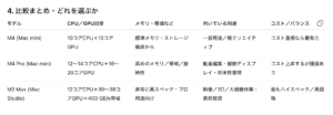 安定稼働性(24時間運用):静音・冷却・信頼性が重要。どのモデルもApple製チップで冷却仕様も優れていますが、高負荷状態を長時間続けるならThermal余裕のあるモデル(M4 Pro/M2 Max)を選ぶ意味あり。